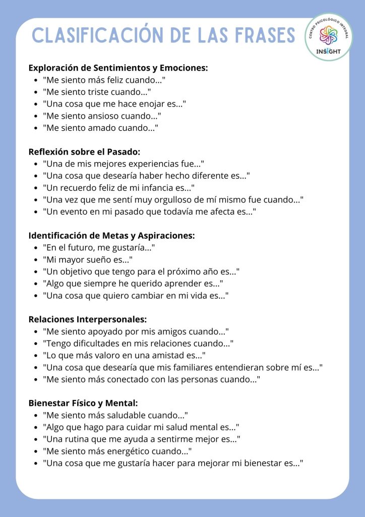 Sentimientos y emociones, reflexiones sobre el pasado, identificación de metas y aspiraciones, relaciones interpersonales, bienestar físico y mental, autoconocimiento y autoestima, manejo del estrés y la ansiedad, reflexiones sobre el presente, problemas y soluciones, creatividad y expresión personal.